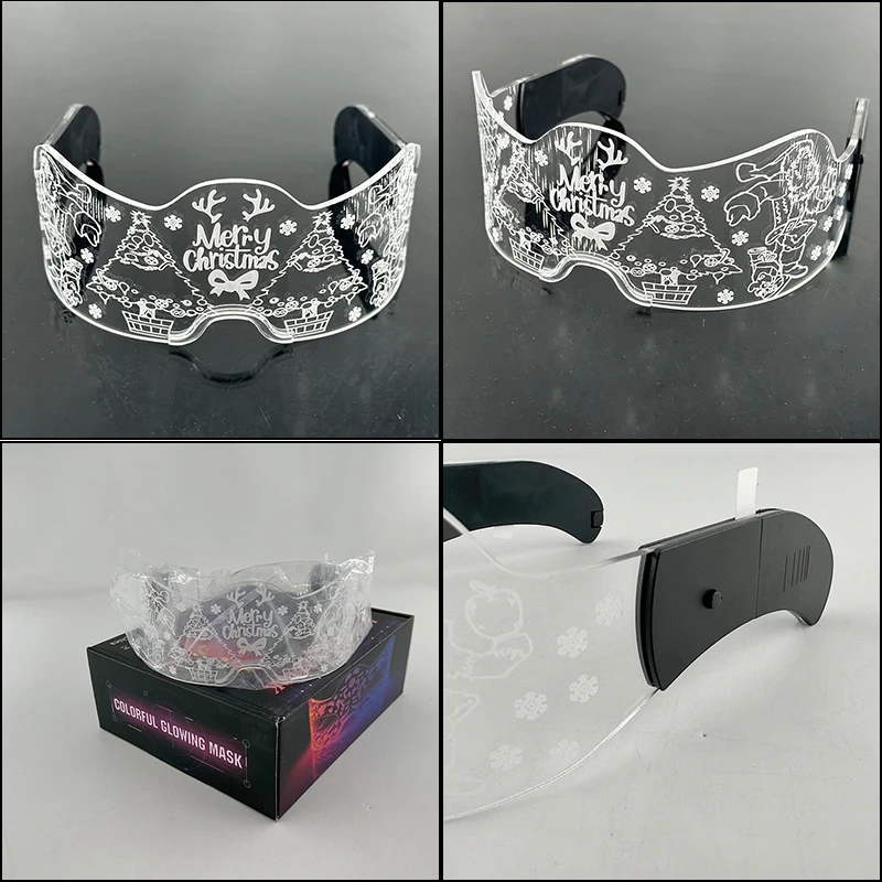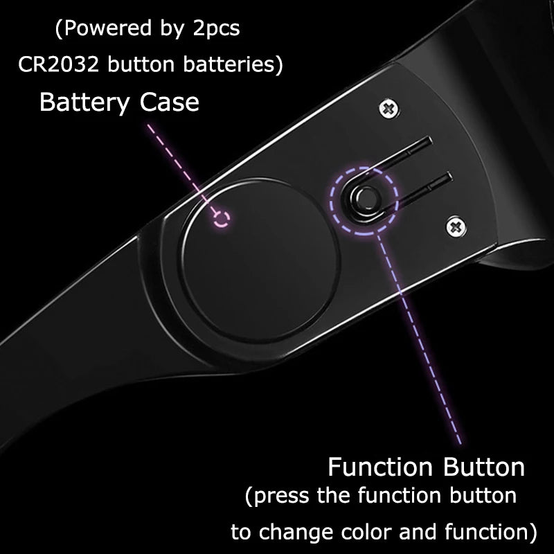 Select the lighting mode: LED glasses is two sides controlled . Press the black button on the side, and each time you press it, the LEDs will change among below 12 lighting modes: